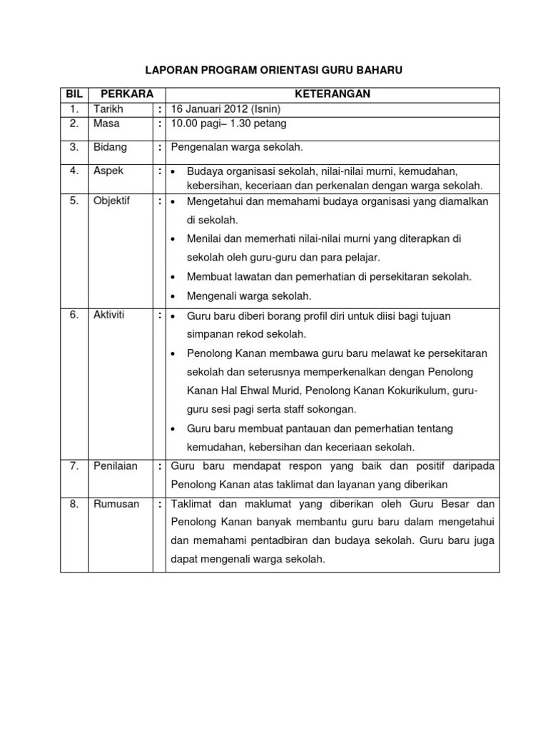 Laporan program orientasi guru baharu. Laporan ros (rancangan orientasi sekolah/institusi) program sarjana muda pendidikan teknik & vokasional fakulti pendidikan teknikal & vokasional uthm. Kumpulan contoh laporan kegiatan, sekolah, pelatihan, pramuka, pentas seni, lomba, pps, membaca buku fiksi beserta dengan struktur. Adanya kesenjangan 40%, hal ini karena masih minimnya kesadaran siswa akan. Ini merupakan contoh format laporan program sekolah yang ditetapkan oleh jpn kedah.