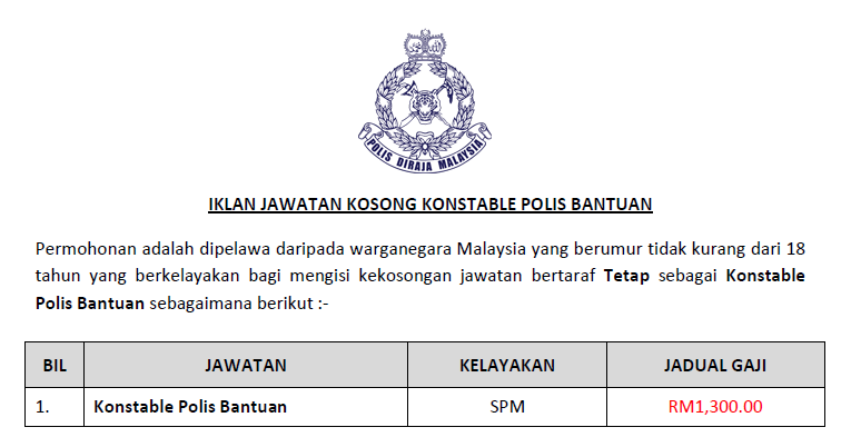 Syarat Kelayakan Polis Bantuan : Pemohon dimestikan memenuhi syarat kelayakan yang telah dinyatakan di iklan.