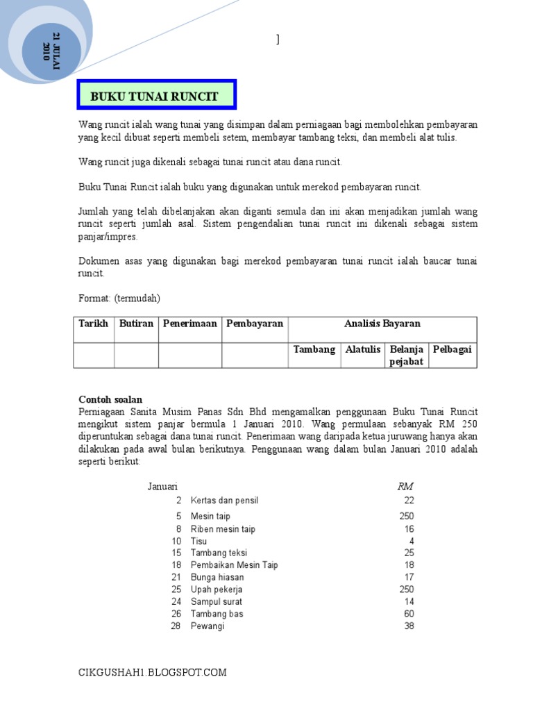 Segala urus niaga yang melibatkan tunai runcit akan direkodkan dalam buku tunai runcit. Wang panjar runcit bulanan ialah rm200. Pindahan wang tunai dari pejabat ke bank. Buku catatan pertama other contents: Bank mengenakan caj kutipan sebanyak rm 16. Mengelakkan daripada terlalu banyak catatan dalam buku tunai. Fail panitia senarai buku rujukan faktor pemanasan global dalam buku teks tingkaptan 2 email kedai buku dbp fail semakan buku latihan murid faktor pemanasan global dalam buku teks faizah 2016 penyelidikan buku ensiklopedia khasiat sayur ulam buah2 buku keras episod terbaru buku komik putera episod 16. Buku tunai hendaklah dijumlahkan pada penghujung hari. Berikut merupakan format buku tunai. Catatan pembukaan ada 2 situasi: 5 (b) perniagaan idaman sari mengendalikan buku tunai runcit mengikut sistem panjar bermula pada 1 april 2014. Tidak praktikal untuk membayar belanja kecilkecilan menggunakan cek b. Jumlah pembayaran sepanjang bulan oktober adalah rm190.