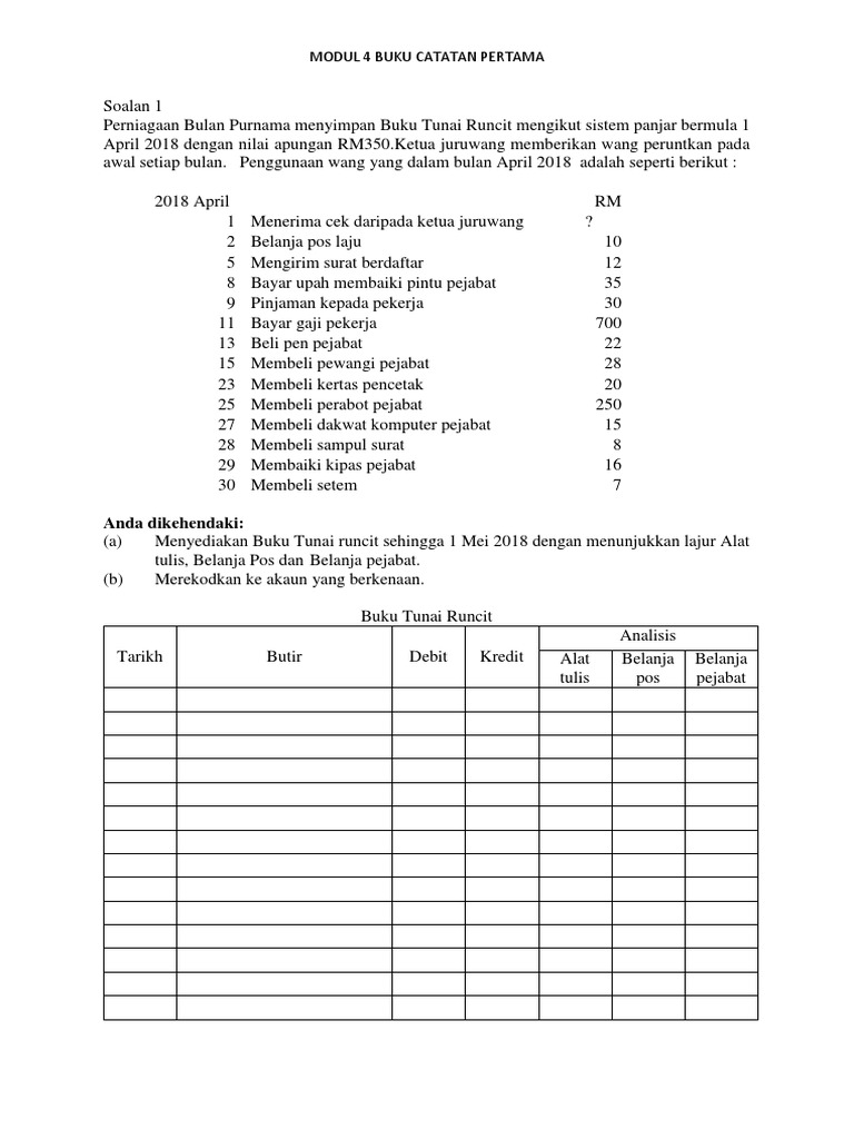 Menyimpan buku tunai runcit mengikut sistem panjar. Cek tak layan daripada abc berjumlah rm 420. Add to my workbooks (1) add to google classroom add to microsoft teams share through whatsapp: Cek rm jan 01 baki b b 1 500 00 jan 2 dollah 123 100 00 10 jualan 300 00 13 ahmad 154 200 00 28 junaidah 200 00 19 yeow 162 400 00 31 baki c d 1 300. Jumlah lajur analisis belanja sahaja.